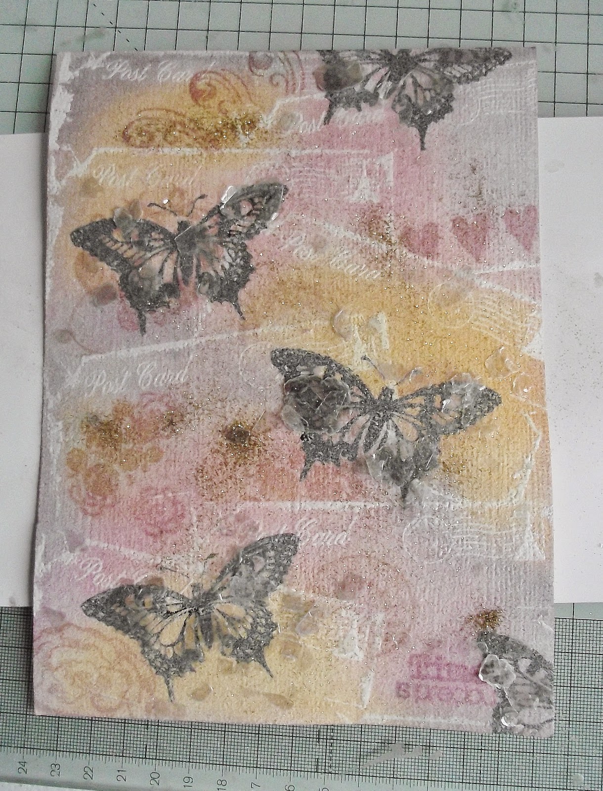 Next using Perfect Medium, I took images from the Postcard stamp set and also the Roses stamp set and randomly stamped them over my background. Using the pearlescent pan pastels, I coloured the stamped images in. As a final step, I stamped the butterfly image from the Postcard set with Rangers Archival black ink pad.