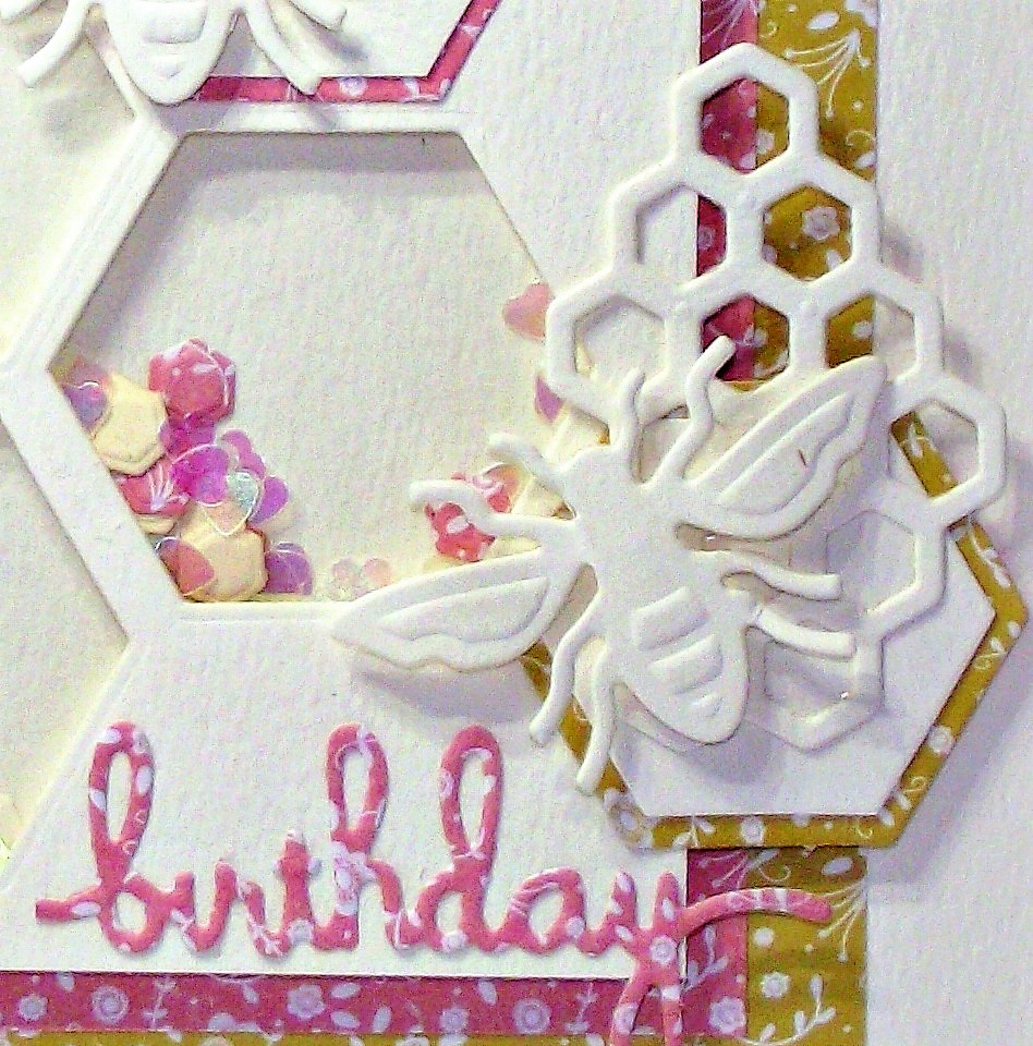 I decided to create a honeycomb effect with the hexagon die and make a shaker card. The little bits inside are a mixture of sequins and the waste from the 'real' honeycomb die.