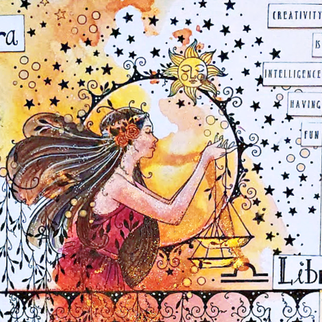 This piece began on an A4 piece of water colour card adding a few splashes of Ink It inks in Saffron & Garnet. When it was dry I stamped the Libra image over the inky part I like the best. Libra has been coloured with Ink It inks and highlights added using Copper Kettle & Treasure Chest Sparkle Powders.